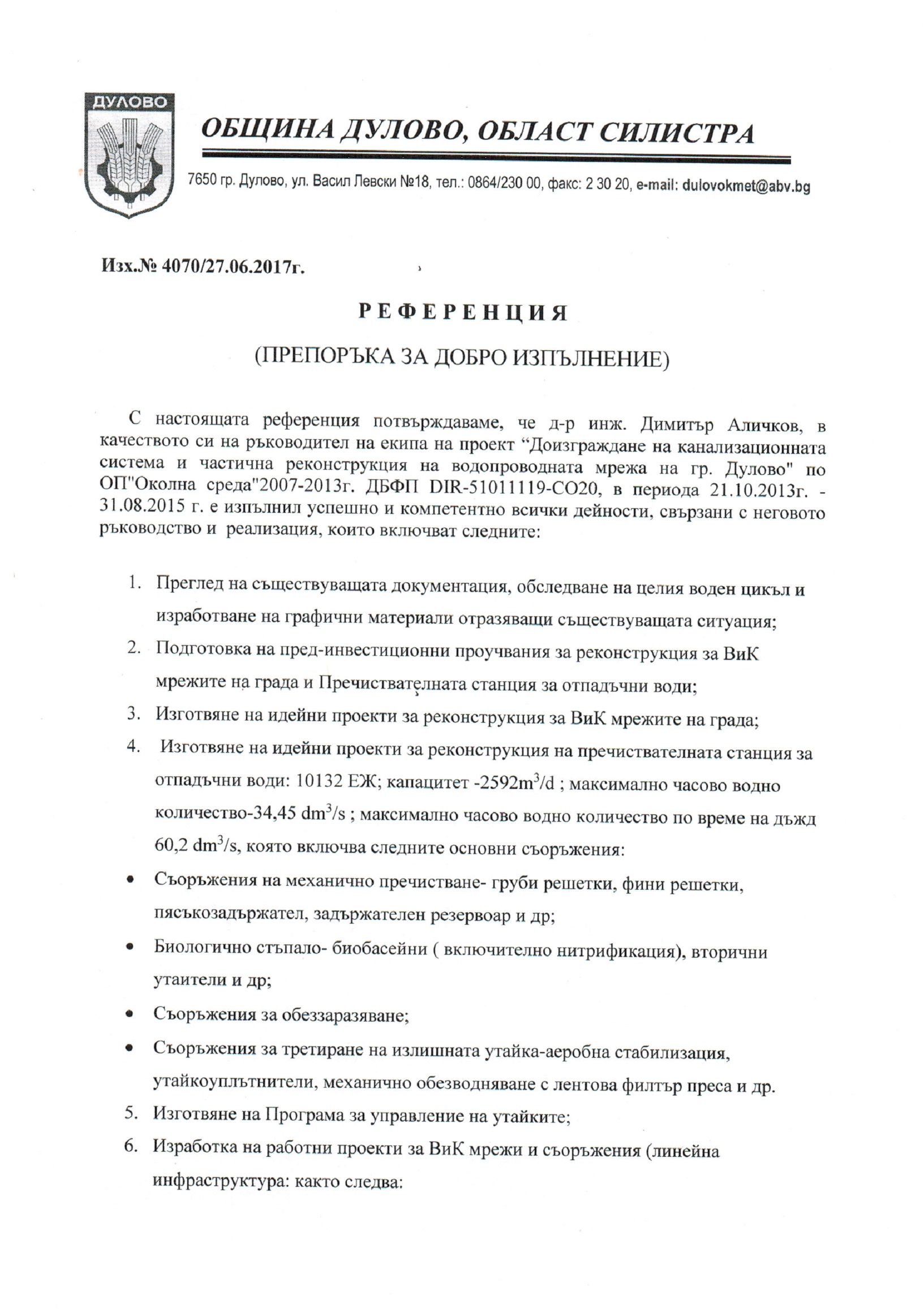 1. Доизграждане на канализационната система и частична реконструкция на водопроводната мрежа на гр. Дулово-прединвестиционни проучвания, идейни и работни проекти на ВиК мрежите и ПСОВ на гр. Дулово, 2013-2015.